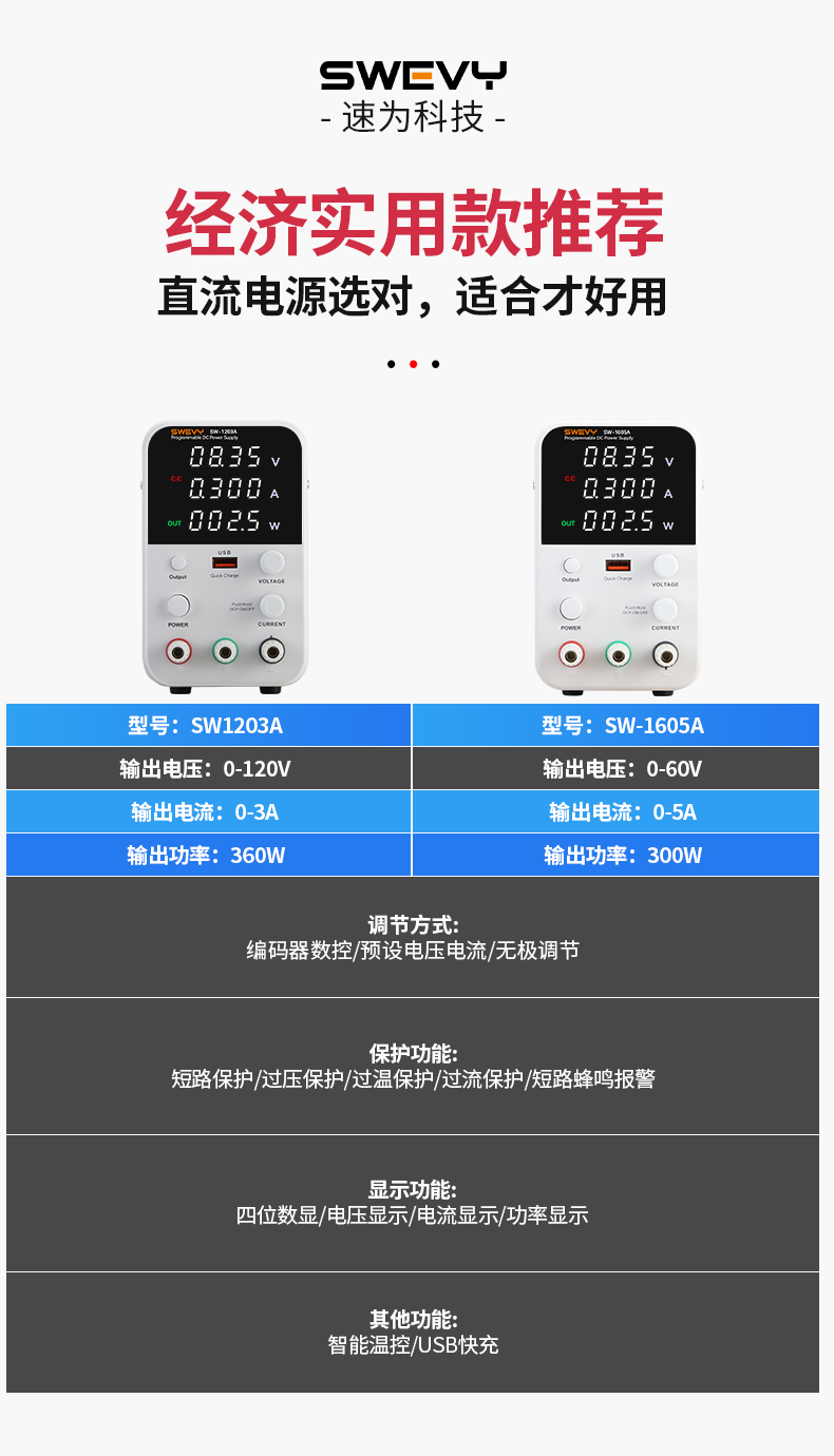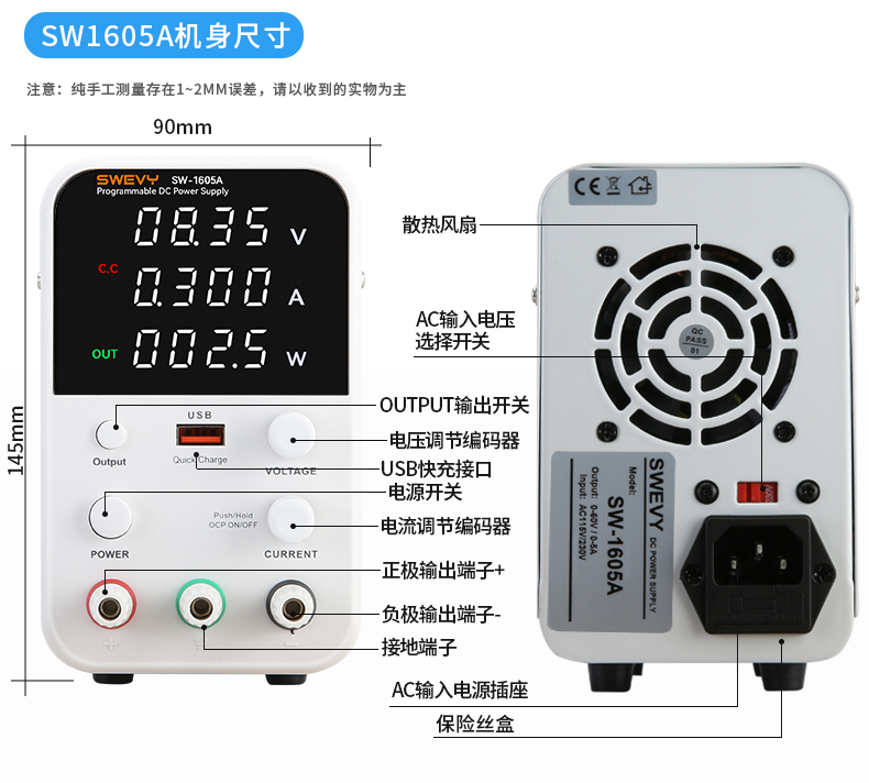 速為可調(diào)直流穩(wěn)壓電源 開關(guān)電源 USB快充 高精度數(shù)顯直流手機(jī)維修電源 SW-1605A(60V5A帶USB快充)